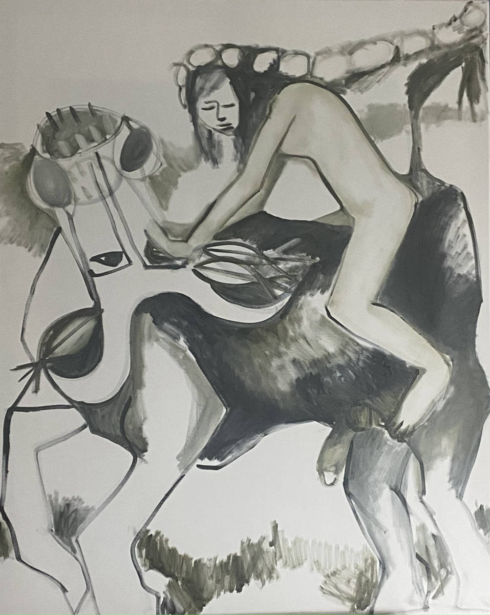 The composition „Minotaur“ by Simone Münkel shows an impressive interpretation of the mythological theme in an abstract, expressive style of painting. The colour palette is reduced to monochrome, earthy tones, which lends the work an archaic, almost dreamlike atmosphere.