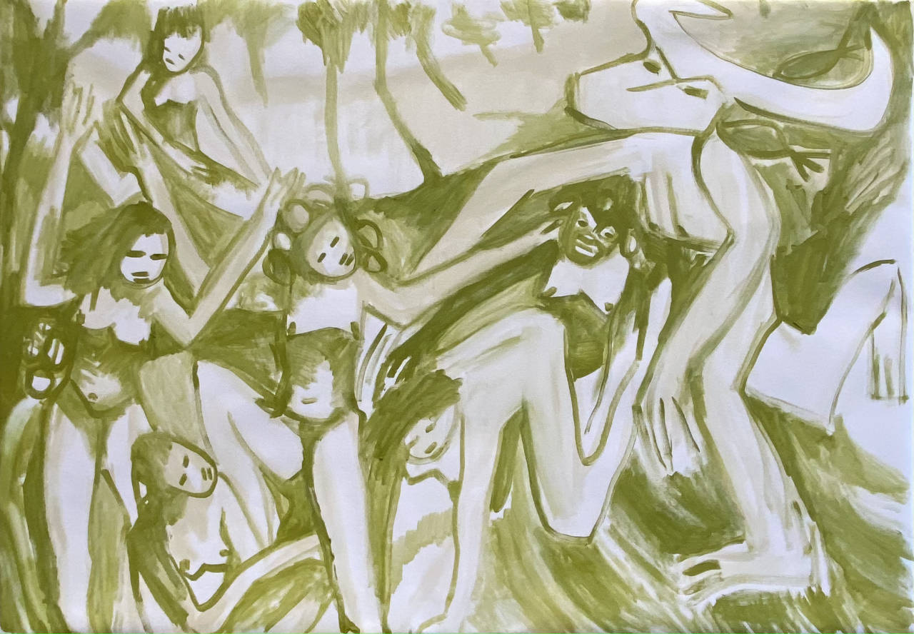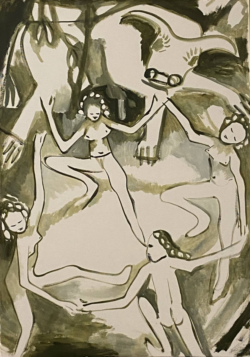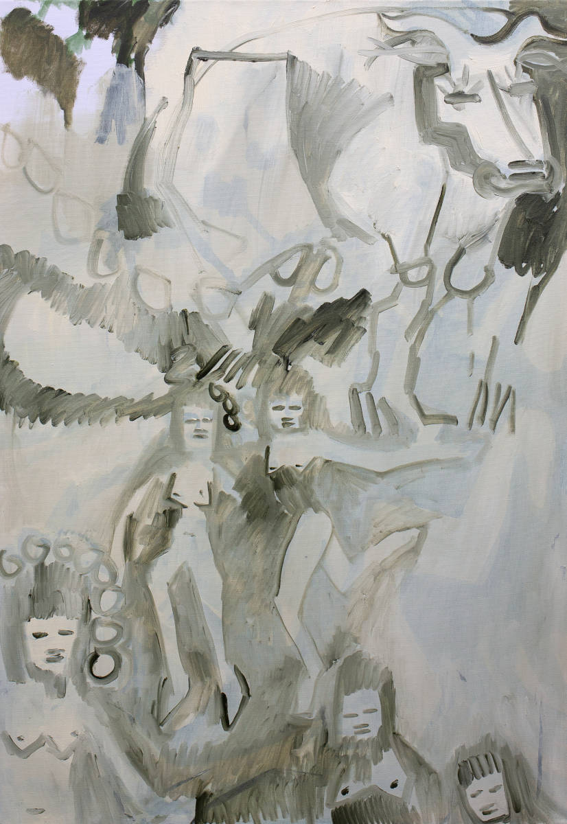 The Minotaur, an iconic figure from Greek mythology, dominates the painting in a raw, almost sketch-like style. Its strong lines and implied movement lend it a menacing presence, while the virgins grouped around it appear to be in a state between fear, surrender and submission to fate.